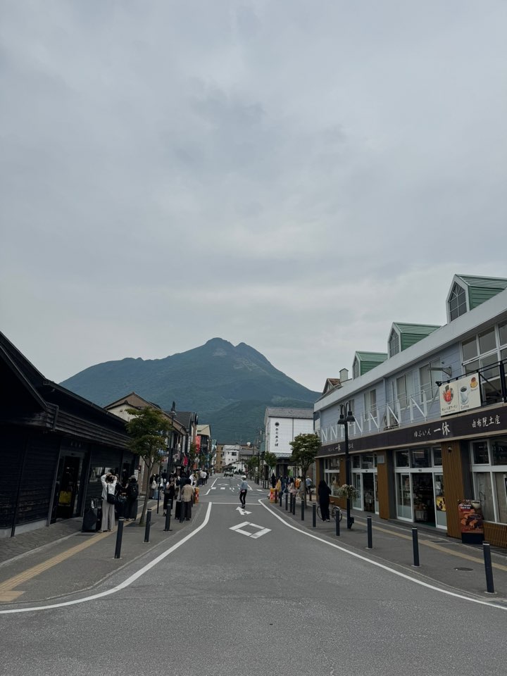 유후인역에 서서 유후인역을 등지고 정면에 보이는 산이 유후다케 입니다.