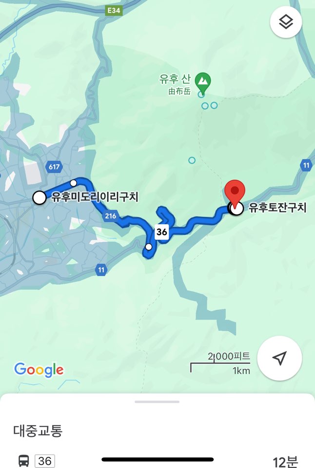 숙소에 짐 맡겨놓고 유후다케로 가는 버스36번 후다닥 탑승